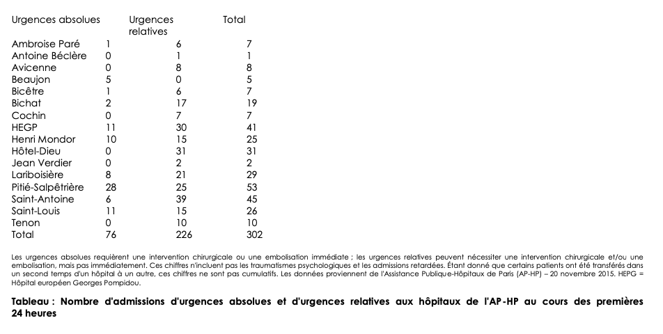 Les interventions télévisées du Professeur Philippe Juvin, chef de service des urgences de l’Hôpital Georges Pompidou (HEGP), le 14 Novembre et les jours suivants, ont été des témoignages démonstratifs, expliquant qu’il avait été prévenu à 23 h que le « Plan blanc » avait été déclenché et que la vague des blessés était arrivée seulement vers 3 heures du matin, avec très vite un manque de matériel et de soignants compensé heureusement par une arrivée quasi spontanée de médecins généralistes du voisinage et d’anciens internes pour les aider, sans envisager à aucun moment la possibilité de transférer ou de demander au SAMU d’envoyer les blessés directement vers d’autres établissements, ou des cliniques privées !